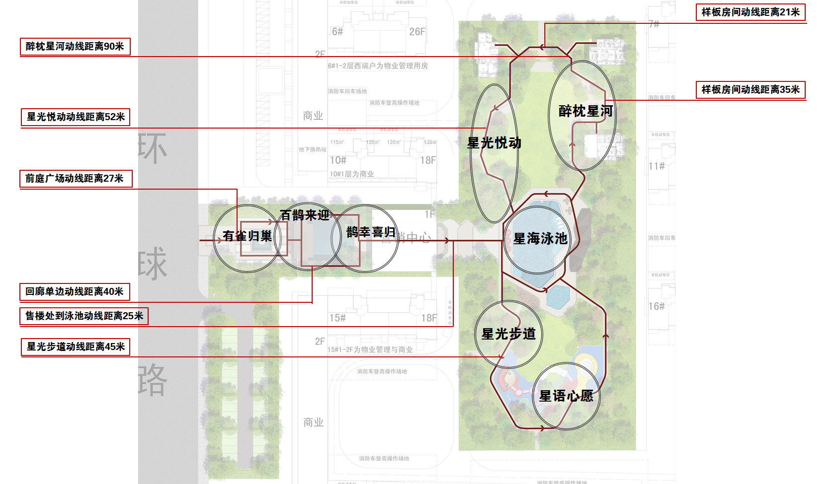 星光步道——曲徑通幽,兩側(cè)林蔭成趣,芳草鮮美,落英繽紛,自然引導(dǎo)客戶沿著精心設(shè)計(jì)的游線進(jìn)入下一個(gè)雅趣空間。